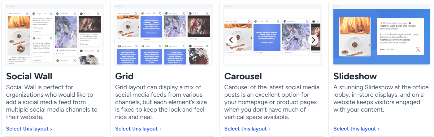- Layout options such as Social Wall, Grid, Carousel, and Slideshow allow you to match your brand style to your goals for maximum visual impact.