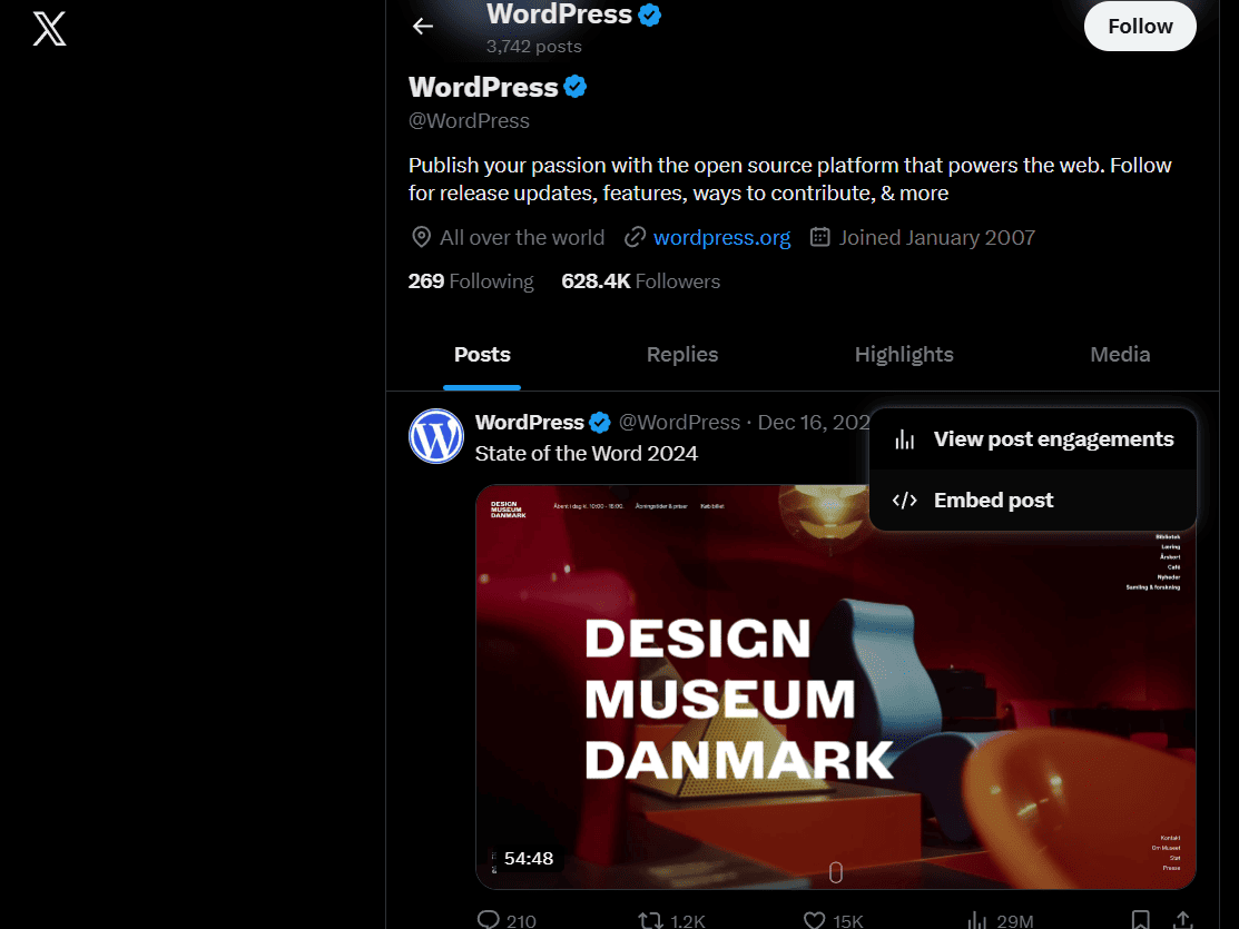 - Search for the tweet you want to embed. Click the “more(...)” icon and select “embed post”.