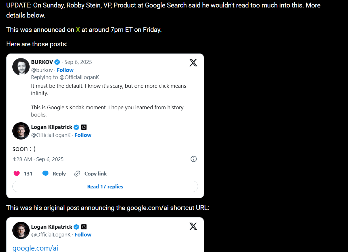 Here is an example of how Search Engine Roundtable embeds tweets on their website from industry leaders to inform readers on certain news topics and announcements.