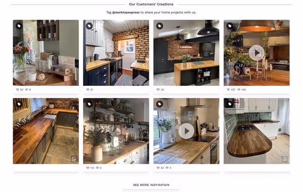 Worktop Express, an online worktop supplier, collects and embeds images of how customers use their products for home design on the section "Our Customers’ Creations" of their homepage. Moreover, after clicking any of the images on the shoppable UGC feed, the website visitor finds the matching product. Well done, Worktop!