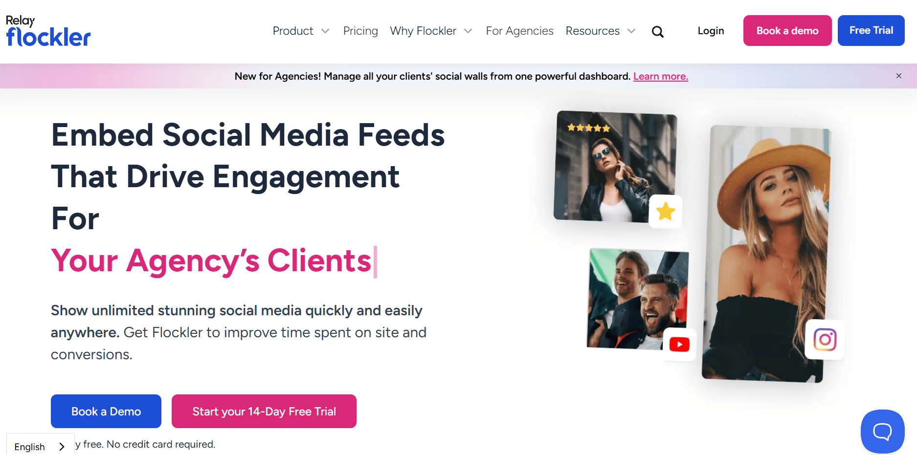 Add your first live social feed to your website instantly with the Flockler free trial for 14 days (no credit card needed).