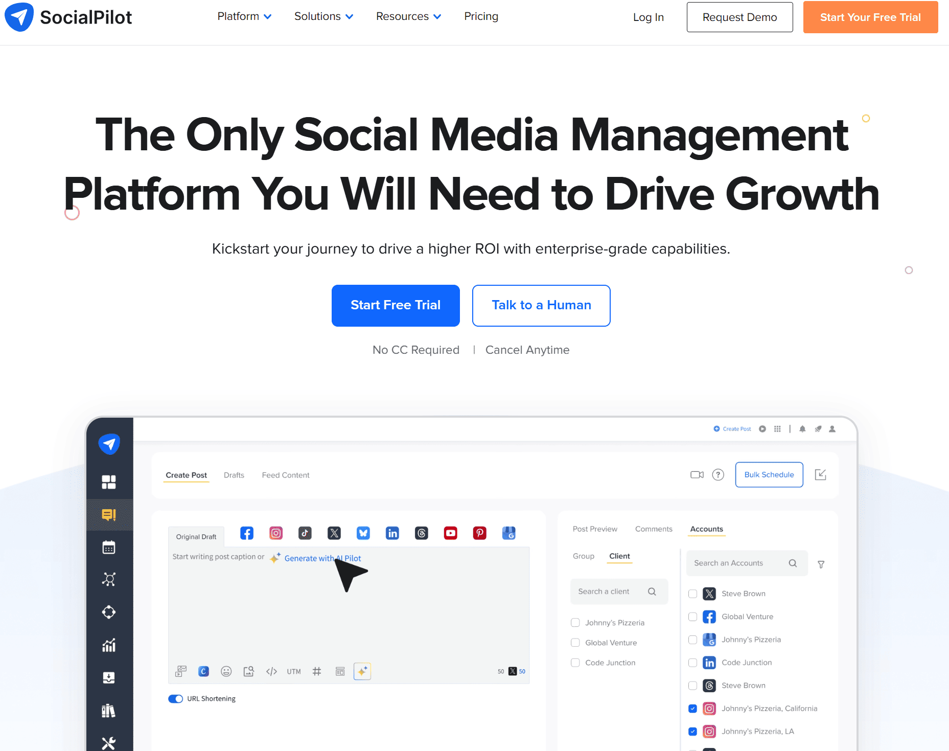 SocialPilot is a user-friendly platform that helps large teams, agencies, and multi-location brands simplify content planning, creation, and scheduling across multiple channels.