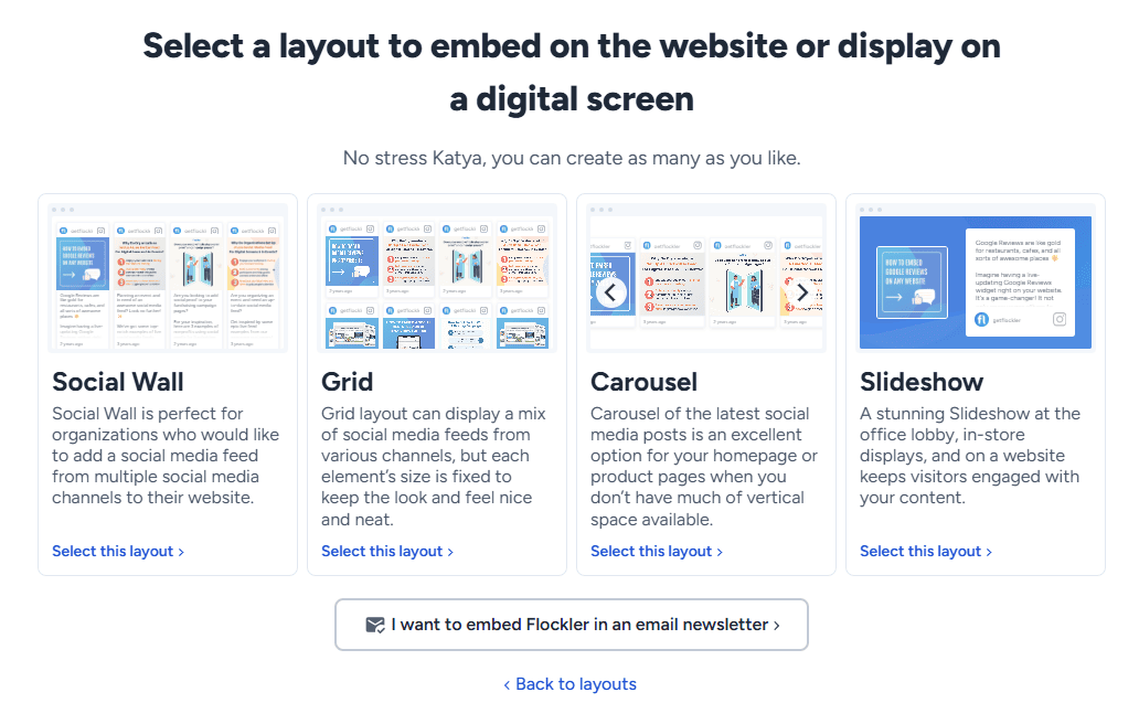 Flockler offers four display formats: Wall, Grid, Carousel, and Slideshow. You can create unlimited layouts from a single content source. That means a grid on your product page and a carousel on your homepage can both pull from the same feed. There is no limit on layouts or on the number of websites where you embed them.