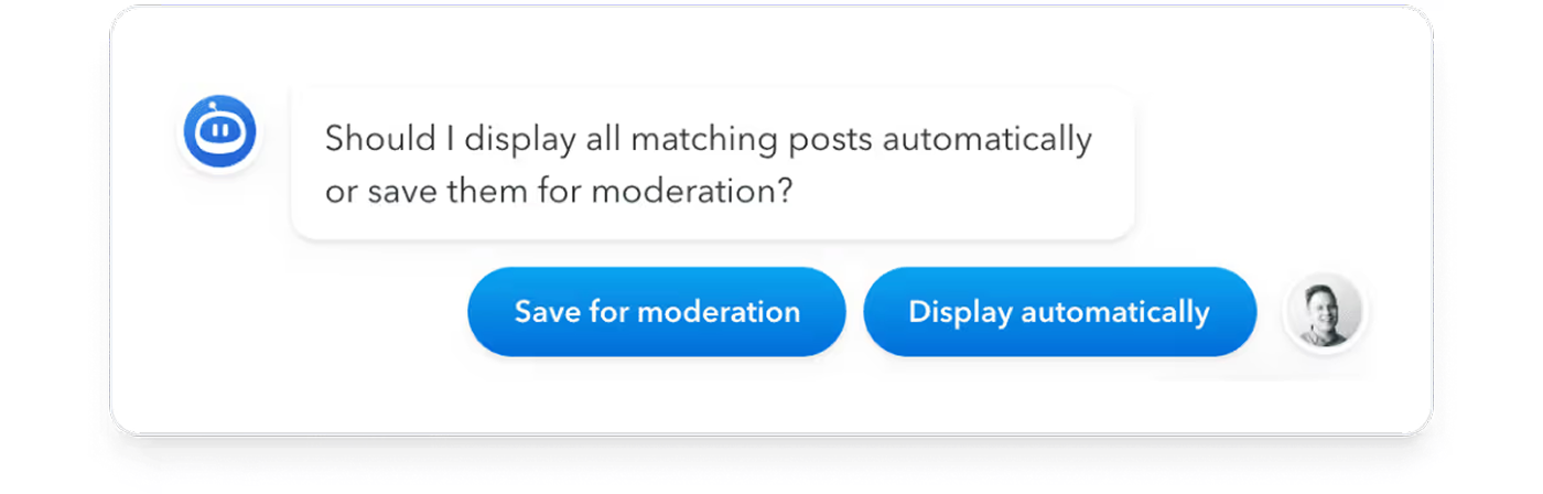 Flockler has standard filtering for most social channels, plus manual blacklists. Maintain a clean, brand-safe display with automatic filters, approval workflows, and keyword/user blocking.