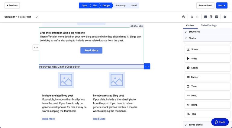 - Ouvrez l’éditeur de contenu d’email, et sélectionnez le bloc “HTML”. Glissez-déposez-le vers la droite.