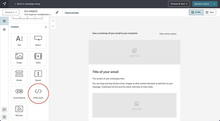 - Ouvrez l’éditeur d’email, et ajoutez le bloc “HTML” vers la gauche.